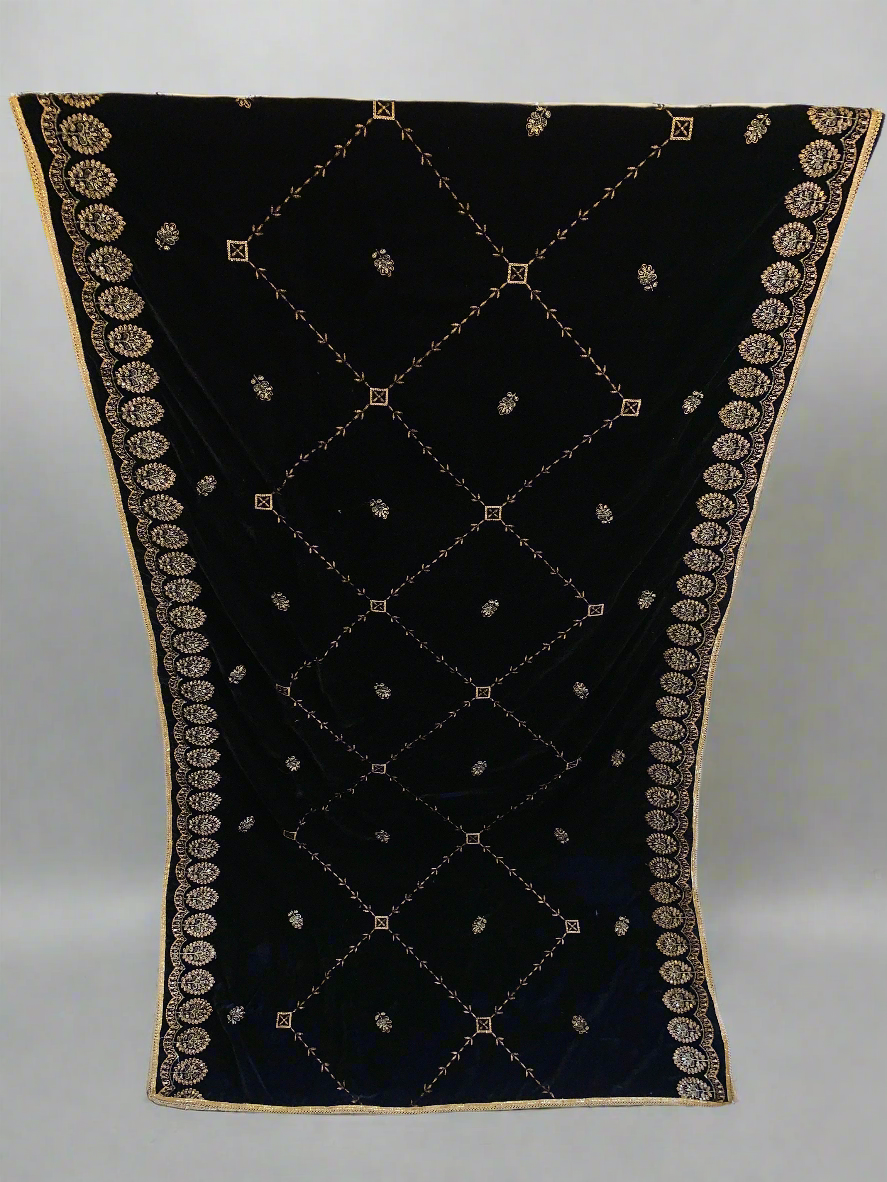 Makhmal by Tata fabrics brings you with an elegant velvet shawl, ideal for formal wear. It has a plush, soft texture and a deep, rich color that gives it a luxurious feel. The shawl is detailed with intricate embroidery on all four sides. The embroidery is done in a striking gold and silver thread, creating an ornate border with a floral and paisley motif. This detailed design contrasts beautifully with the dark velvet fabric.
