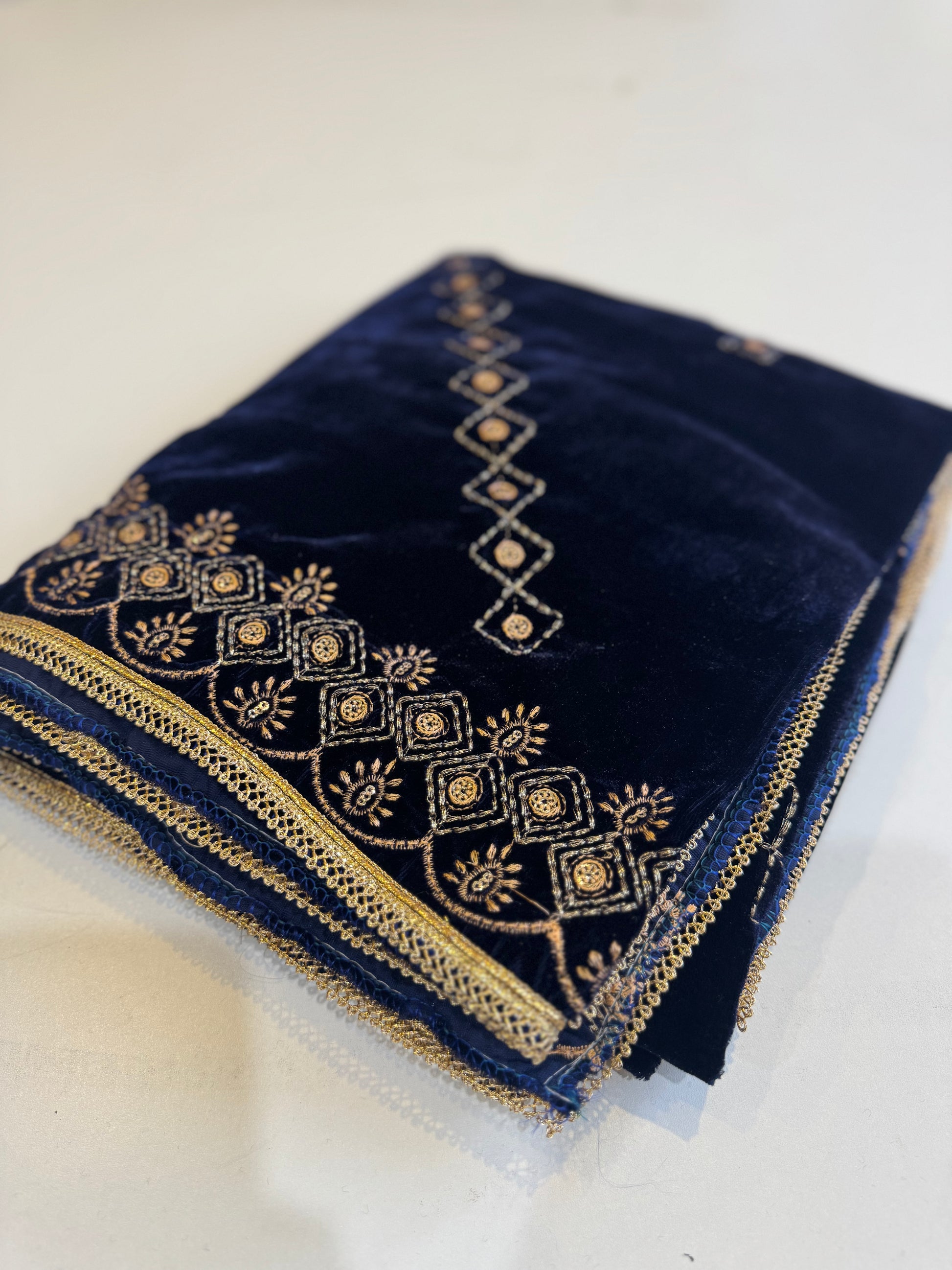 Makhmal by Tata fabrics brings you with an elegant velvet shawl, ideal for formal wear. It has a plush, soft texture and a deep, rich color that gives it a luxurious feel. The shawl is detailed with intricate embroidery on all four sides. The embroidery is done in a striking gold and silver thread, creating an ornate border with a floral and paisley motif. This detailed design contrasts beautifully with the dark velvet fabric.