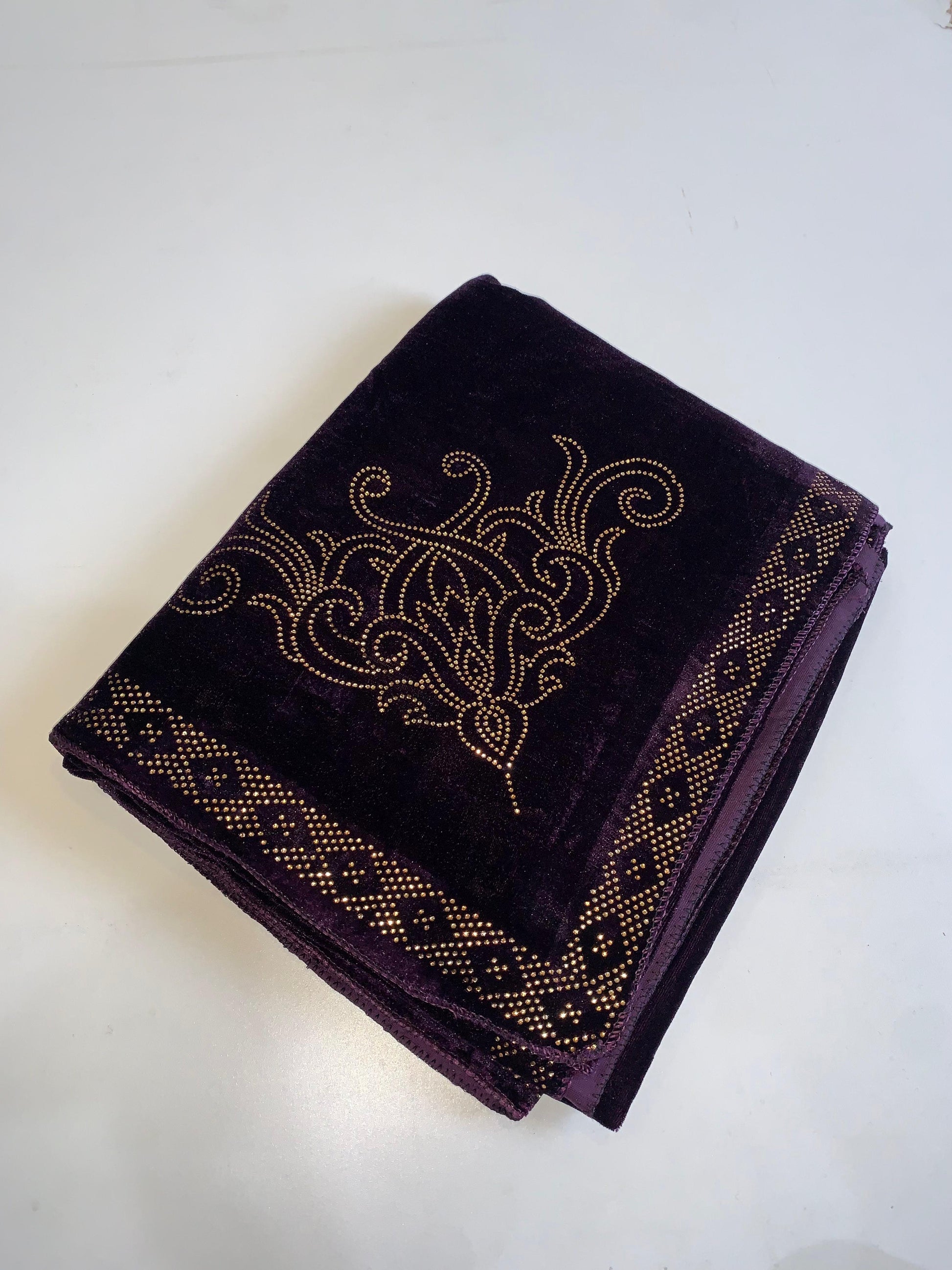 Makhmal by Tata fabrics is detailed with a striking design on all four sides, created with gold and silver dicut and quad cut stones. These stones form an ornate border with a floral and paisley motif. This detailed stonework contrasts beautifully with the dark velvet fabric.