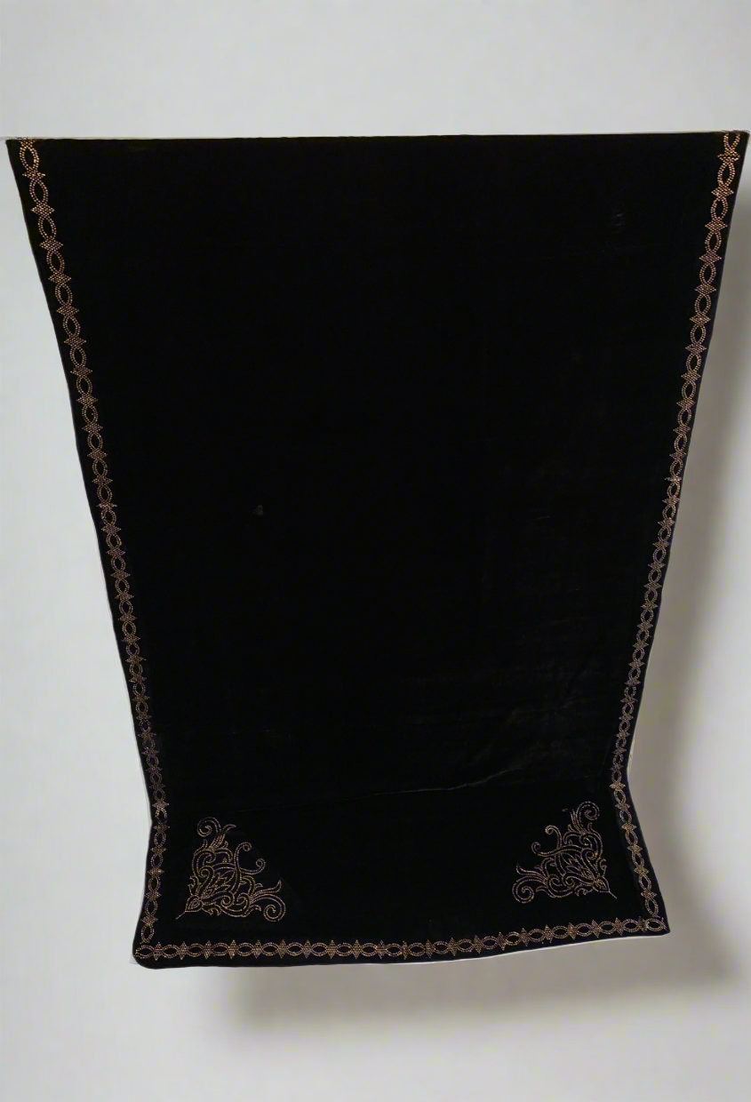 Makhmal by Tata fabrics is detailed with a striking design on all four sides, created with gold and silver dicut and quad cut stones. These stones form an ornate border with a floral and paisley motif. This detailed stonework contrasts beautifully with the dark velvet fabric.
